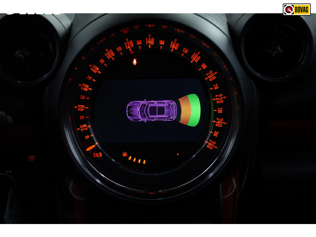 Laat u onderweg niet afleiden, de bediening van het audio-installatiesysteem en ook het navigatiesysteem gaat met knoppen op het stuur. Tot de standaard uitrusting van deze auto hoort ook automatische airconditioning. Boem is ho? Niet bij deze MINI Countryman. De piepjes van de parkeersensoren waarschuwen u op tijd voor obstakels. De cruise control zorgt voor een mooie, gelijkmatige snelheid die u zelf instelt. Dat is relaxt! Geen capriolen meer als u met armen vol de auto moet openen. De keyless entry heeft u al herkend en ontgrendelt de MINI Countryman automatisch. Ook sportstuurwiel, buitentemperatuurmeter, automatisch dimmende binnenspiegel, centrale deurvergrendeling met afstandsbediening en boordcomputer horen tot de voorzieningen op deze auto.